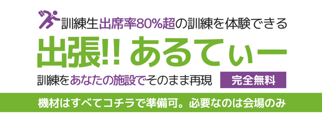 あるてぃー訓練生の9割が、精神疾患を持つ方です。協調性とコミュニケーション力が身についた訓練生に人気のある訓練をあなたの施設で再現します。必要な機材は、あるてぃーで揃えます。必要なのは「場所」だけです。しかも、費用は0円。訓練生が、成長できた理由をあなたも体験してみませんか?